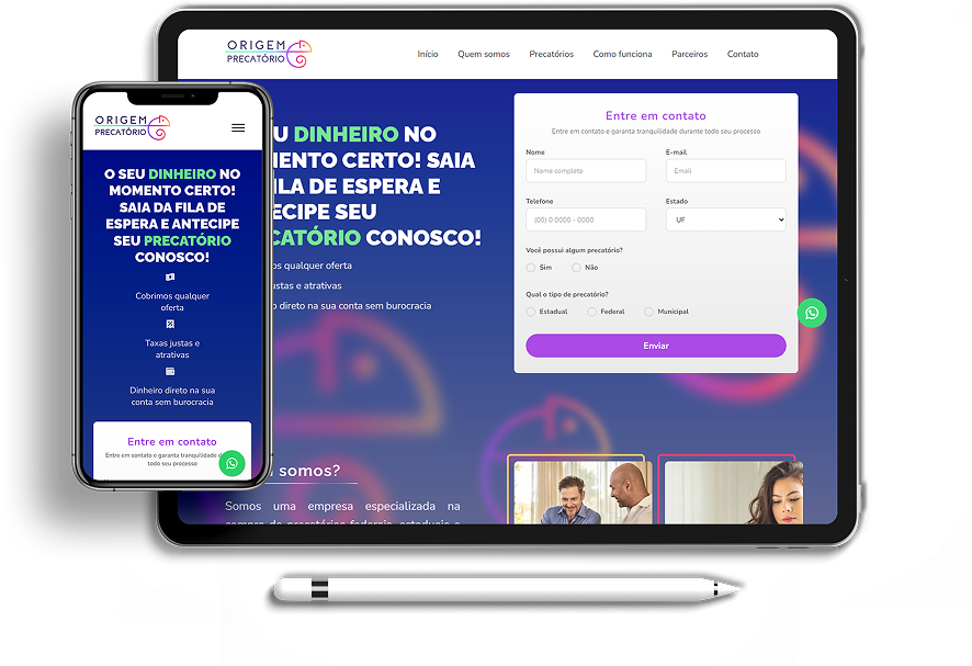 O desafio da 2i9 Negócios Digitais foi criar uma Landing Page para a Origem Precatório que não apenas explicasse um processo jurídico complexo de forma simples, mas que transmitisse credibilidade imediata. O objetivo era claro: transformar visitantes receosos em leads qualificados, interessados em antecipar seus recebíveis.